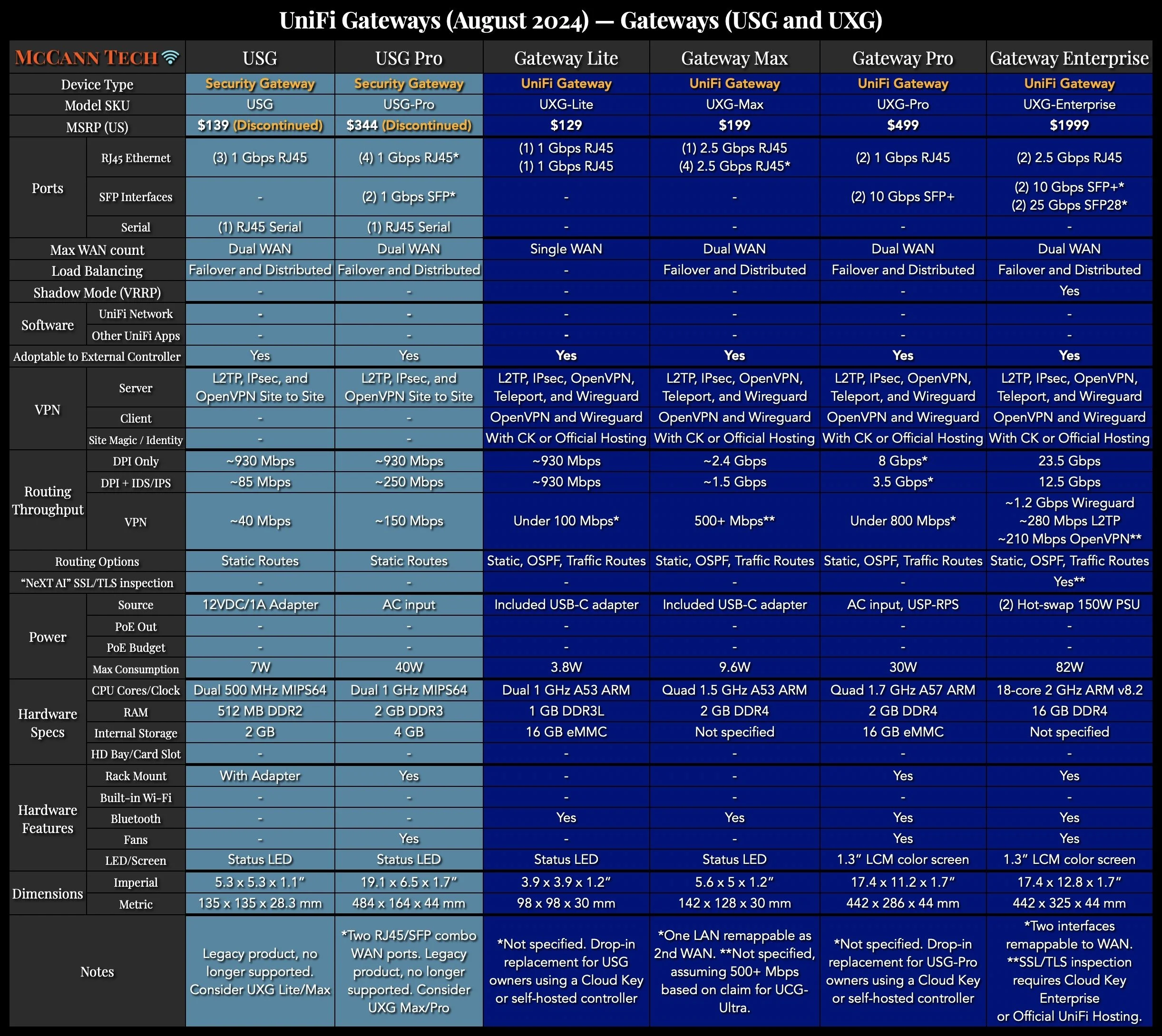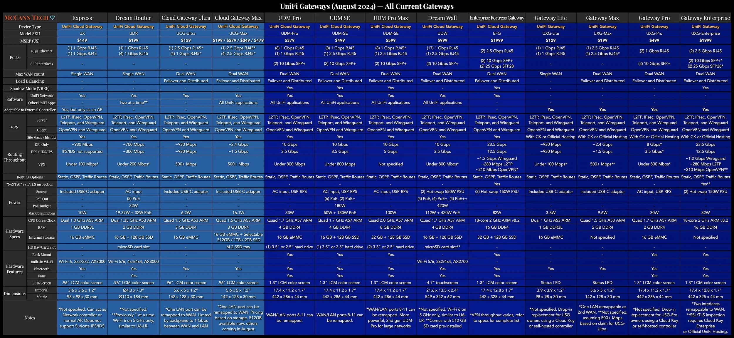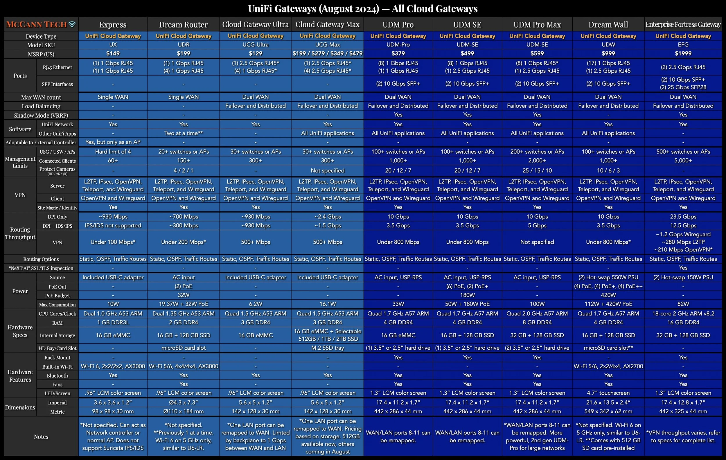 For those that prefer more detail, I’ve made some more in-depth comparisons. See the rest of my latest UniFi Network Comparison Charts, and my UniFi Gateway Comparison for more details.